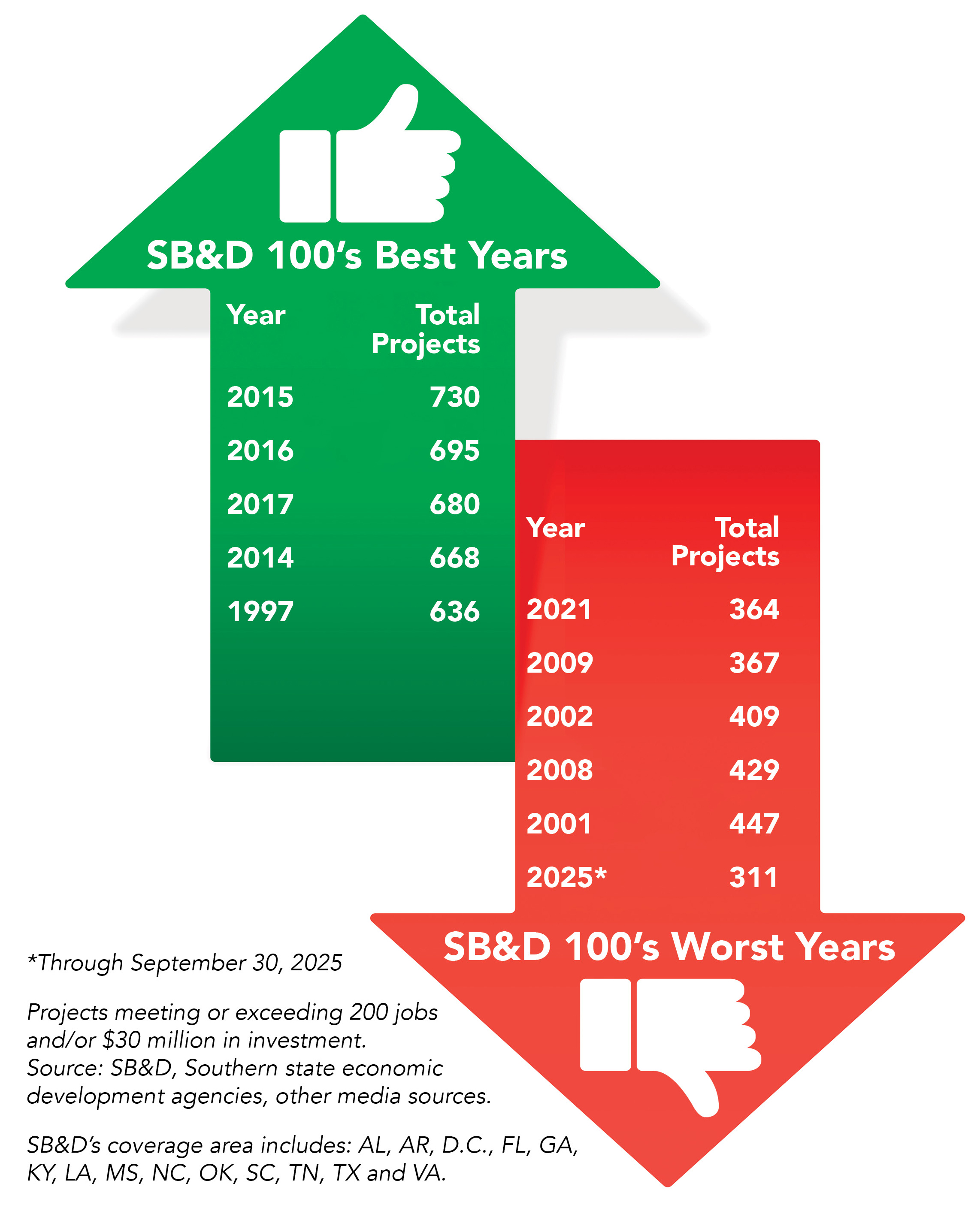 Shown below are the South’s best years and worst years since 1993 in projects meeting or exceeding Southern Business & Development’s thresholds. As you can see in the “SB&D 100’s Worst Years,” while we still have two months of data to add to the total project “cart,” this year might end up being around some of the worst deal total years in the South’s history, or at least since 1994.